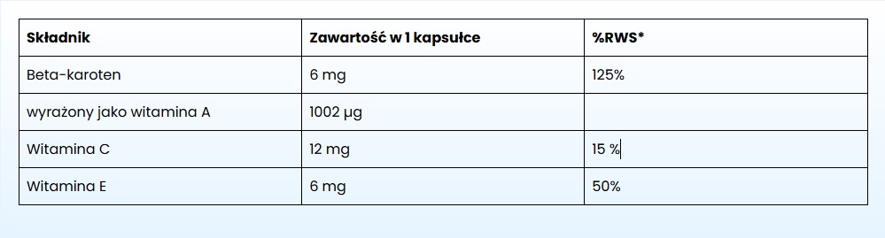 Składniki aktywne: Witamina C (12 mg) 15%RWS*, beta-karoten (6 mg), witamina E (6 mga-TE) 50%RWS*