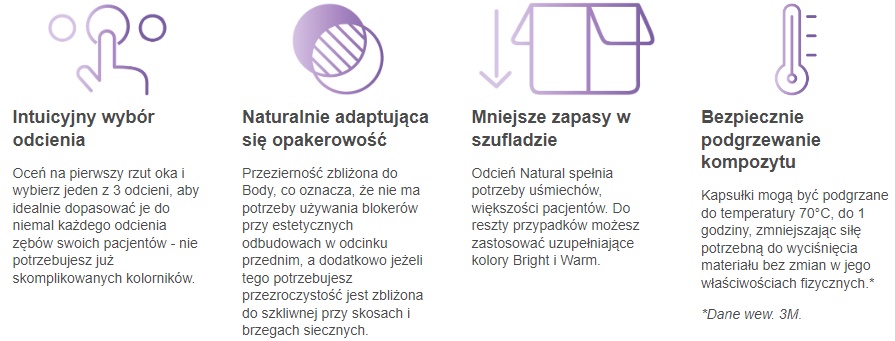 Oparty na naturalnej adaptacyjnej opakerowości oraz 50 latach doświadczenia naukowego i innowacji, uniwersalny materiał kompozytowy 3M™ Filtek™ Easy Match oferuje nowy intuicyjny system doboru odcienia, aby wszystkie odbudowy bezpośrednie zębów stały się jeszcze prostsze, bez poświęcania odpowiedniego poziomu nieprzezierności. System złożony tylko z 3 odcieni został zaprojektowany, tak aby zapewnić doskonałe dopasowanie odcienia w prosty i intuicyjny sposób w większości przypadków.