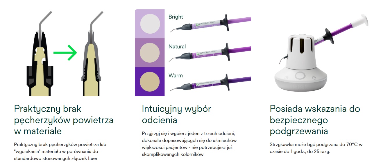 - Strzykawka z materiałem może być bezpiecznie podgrzewana do 70°C w czasie do 1 godz., do 25 razy - przy użyciu podgrzewacza do kompozytów Solventum™ Filtek™ Composite Warmer.