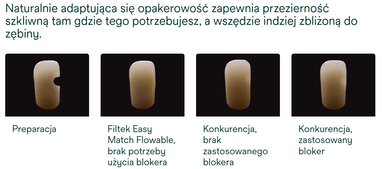 - Naturalnie adaptująca się opakerowość zapewnia przezierność szkliwną przy skosach i brzegach siecznych, ale także zębinową w pozostałych przypadkach, bez konieczności stosowania blokera.