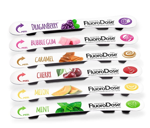 FluoroDose to lakier do fluoryzacji zębów zawierający 5% fluorku sodu (22 600 ppm), pakowany w jednorazowe dawki LolliPack, całkowicie aseptyczne i łatwe w zastosowaniu. Fluoro Dose nie barwi zębów na żółto i nie ma gorzkiego smaku. Wystarczy zdjąć opakowanie, osuszyć zęby, zanurzyć aplikator i można nakładać. Dawka fluoru dopuszczona przez FDA