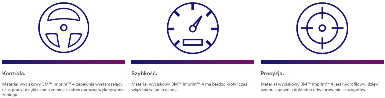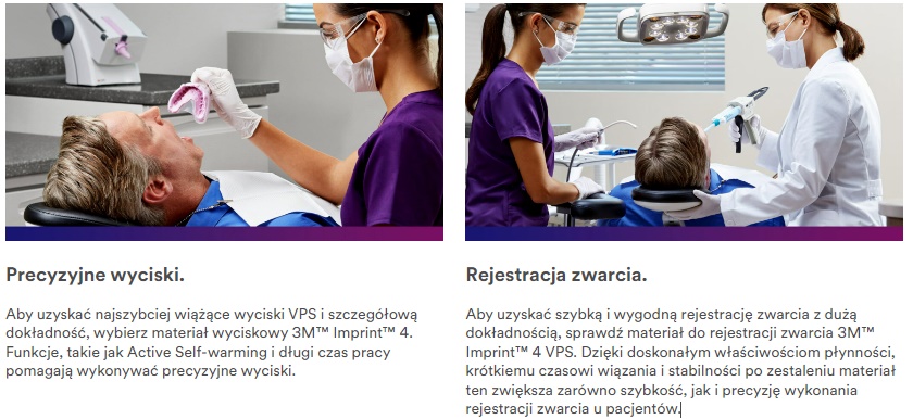 Materiał wyciskowy 3M™ Imprint™ 4 VPS zapewnia idealną równowagę pomiędzy wystarczającą ilością czasu do pracy dla Ciebie i krótszym czasem spędzonym na fotelu przez pacjentów, dając Ci większą kontrolę w celu uzyskania dokładniejszych wycisków przy jednoczesnej poprawie komfortu pacjenta. Aktywna, samonagrzewająca się chemia oznacza, że czas utwardzania rozpoczyna się dopiero po zakończeniu czasu pracy, dzięki czemu masz dużo czasu na załadowanie i ustawienie tacy. Hydrofilowy materiał natychmiast wypiera wilgoć w fazie nieutwardzonej, co pomaga zapobiegać powstawaniu pustych przestrzeni zakłócających szczegóły wycisku. Materiał wyciskowy 3M™ Imprint™ 4 VPS pomaga uzyskać wyjątkową dokładność za każdym razem.