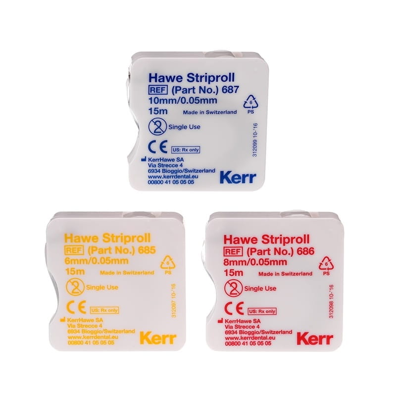 Hawe Striproll to poliestrowe paski o grubości 0,05 mm, w poręcznym dozowniku, przeznaczone do wypełnień w zębach przednich i bocznych. Dostępne są dwa rodzaje pasków: przezroczyste i niebieskie.